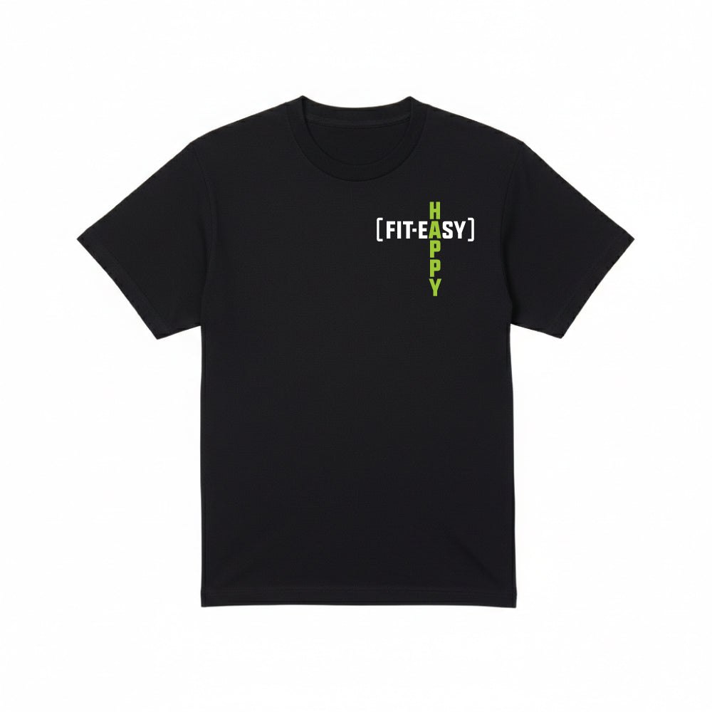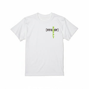 ブランドロゴを活用し、「HAPPY」の文字を垂直にクロスさせた遊び心のあるデザイン。左胸に配されたライムグリーンのアクセントカラーが、モノトーンのボディに映え、クリーンな印象を際立たせます。